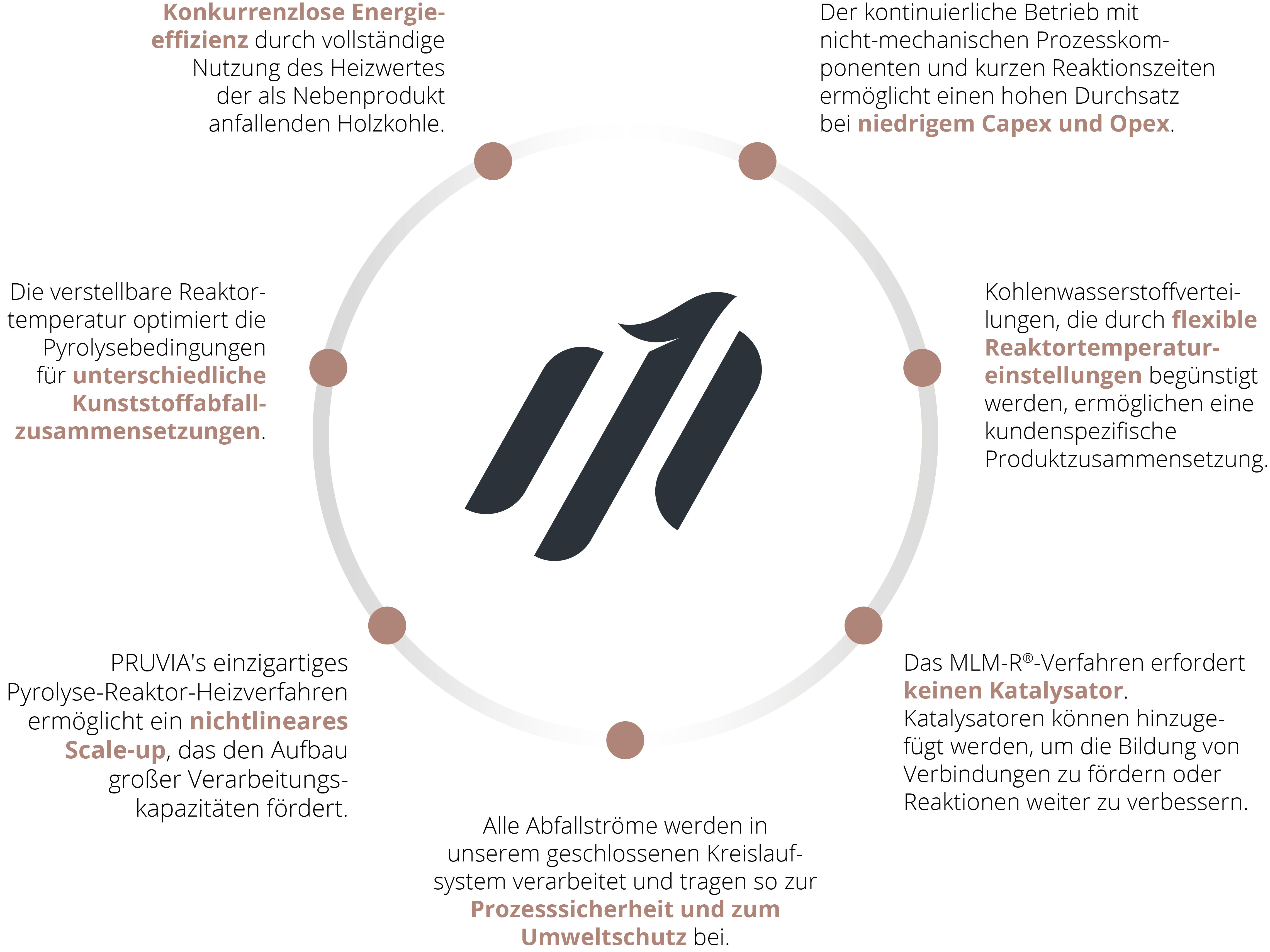 Unsere Technologie schließt die Lücke zwischen dem maschinellen Recycling und der Verbrennung von Plastikmüll. Das ermöglicht eine vollständige Kreislaufwirtschaft für Plastikabfall, die das Plastik in eine kontinuierlich erneuerbare Ressource verwandelt. Auf diese Weise schaffen wir einen Mehrwert und senken gleichzeitig die Entsorgungskosten erheblich. Dadurch ermöglichen wir einen nahezu unendlichen Kreislauf für die Plastikproduktion mit großem CO2 Einsparpotenzial.